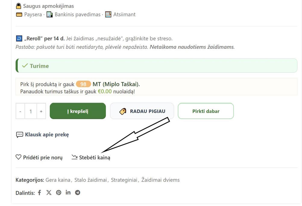 Prie kiekvienos prekės rasite mygtuką „Stebėti kainą“: nurodykite pageidaujamą sumą ir gausite el. laišką, kai prekė pasieks tą kainą. Jei nenorite nurodyti tikslaus skaičiaus — palikite lauką tuščią ir gausite pranešimą, kai prekė nors kiek atpigs.