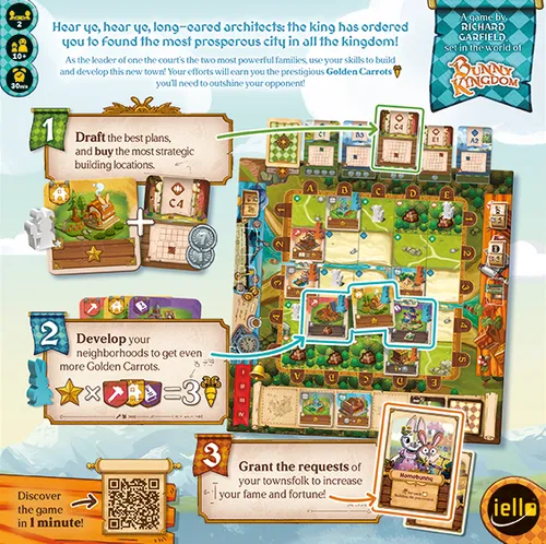Žaidime Bunny Kingdom Town pirksite pastatus, geriausiai atitinkančius jūsų strategiją, ir statysite juos tinkamiausiose vietose, kad plėstumėte savo rajonus ir pelnytumėte dar daugiau auksinių morkų… nebent nuspręsite užimti būtent tą vietą, į kurią taikėsi jūsų priešininkas, ir taip sužlugdysite jo plėtros planus.